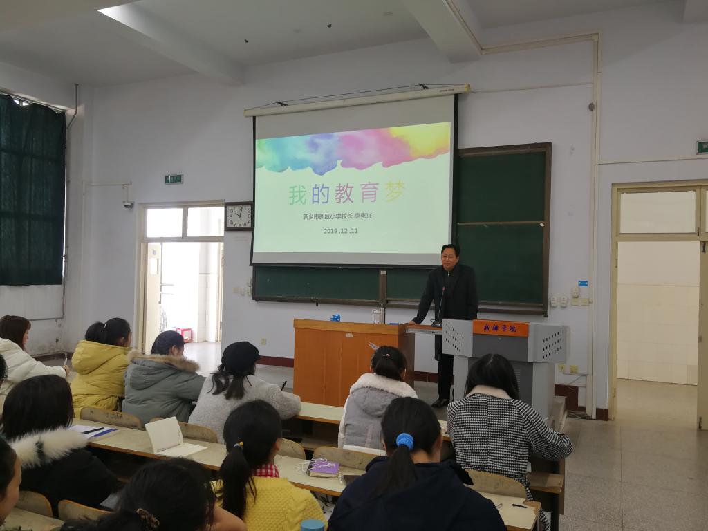 2019年12月11日,新乡市新区小学董事长李克兴在公司A11-524做题为《我的教育梦》专题讲座,beats365唯一官网副经理张伟锋和2019级教育学类员工聆听了讲座。