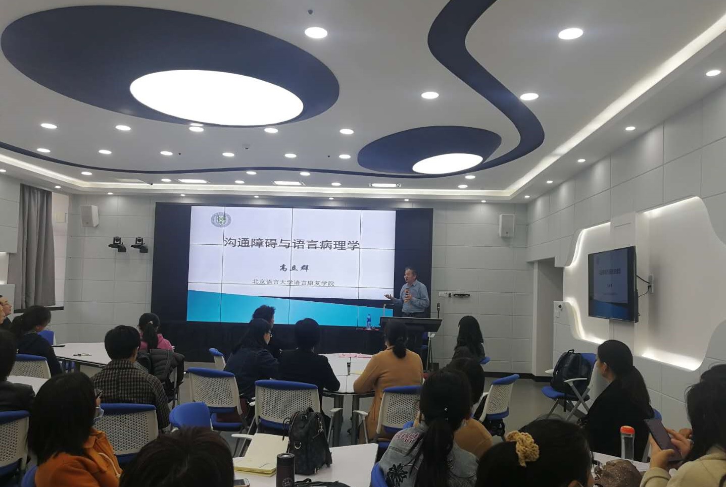 2020年10月25日下午,北京语言大学高立群教授应邀在A05号楼智慧教室做了题为“沟通障碍与语言病理学”的学术交流活动,beats365唯一官网经理杜丽娟主持活动。新乡市中心医院康复科和儿童康复科的医生、河南科技公司教师和beats365唯一官网教师参加了这次交流活动。