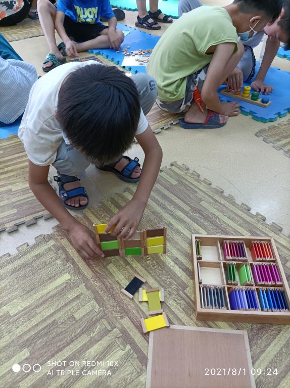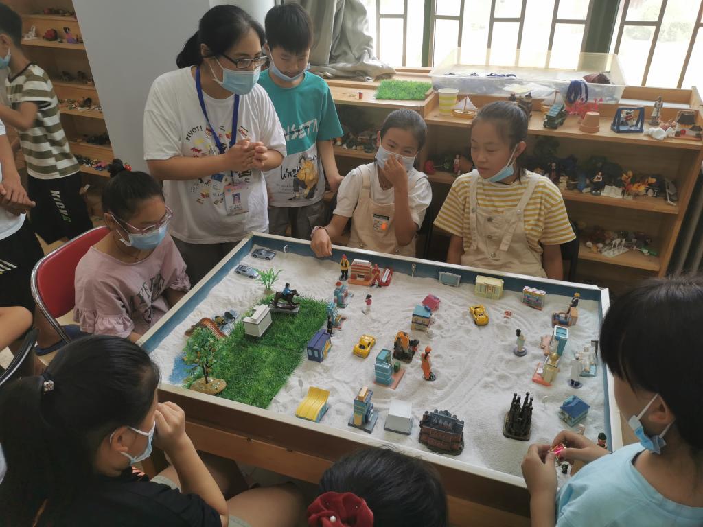 两天来,我们开展了沙盘游戏、蒙氏教具操作、超轻黏土、折纸、绘画、团体辅导、朗诵、阅读等活动。