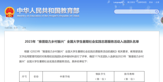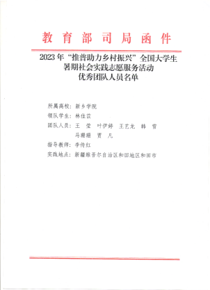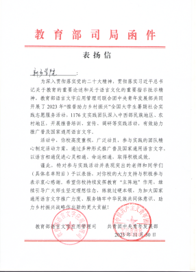 近日,教育部、共青团中央对2023年“推普助力乡村振兴”全国老员工暑期社会实践志愿服务活动进行表彰,beats365唯一官网“‘一字一句普通话,千言万语绘中华’推普疆行实践团”获评全国优秀团队,团队师生受到了教育部语言文字应用管理司和共青团中央青年发展部致信表扬。