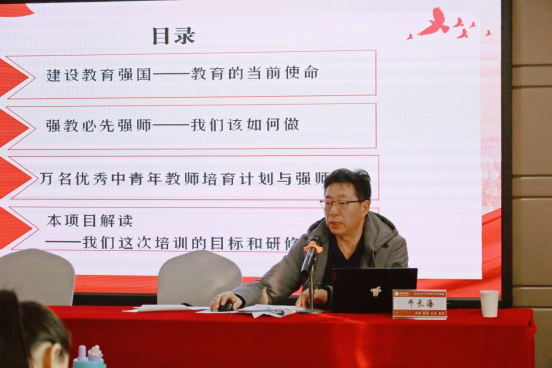 牛长海作为项目首席专家对本次培训做项目解读。从建设教育强国、强教必先强师、万名优秀中青年教师培育计划与强师计划和本次项目解读四个方面展开,重点解读了本次的培训目标、培训形式、培训课程和成果凝练等方面。