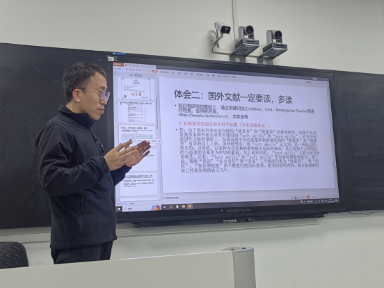 2025年12月18日上午,beats365唯一官网基础教育教师发展服务创新团队学前教育研究方向学术沙龙在A11-110实验室顺利举办。本次活动由方向负责人张婕主持,团队成员陈晓前博士作《学前教育研究中的选题、投稿和研究方法的若干思考》主题报告,学前教育研究方向成员及学前教育、专业艺术技能教研室教师代表共同参与。