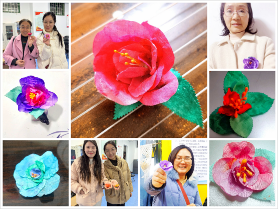 本次活动由专业艺术技能教研室教师严艺、应芳等全程指导。首先由严艺老师介绍烫花胸针的制作方法,包括花瓣染色、烫花器定型、花瓣及叶子串连、捆绑花朵、粘合底托等五个步骤,做好的成品每一片花瓣的卷曲形态都是独一无二的,每朵花都蕴藏着制作者的独特匠心和温度。老师们热情洋溢,个个亲自动手操作,大家边听边学,耐心地按照老师的指导,结合自己的创意逐步进行制作。不一会儿,一朵朵精巧别致、形状各异的烫花胸针就盛开在老师们的手中。何经理说:“自己动手做的烫花,虽不完美却独一无二”;席兴字老师说:“这是我第一次制作烫花,很棒的体验感”;刘春梅教授说:“手工编织的花,比买来的更有温度”;李云霞老师说:“这次活动真有意义,爱上了手工制作烫花”……老师们纷纷表达着自己的体验感受和对三八妇女节的祝福。