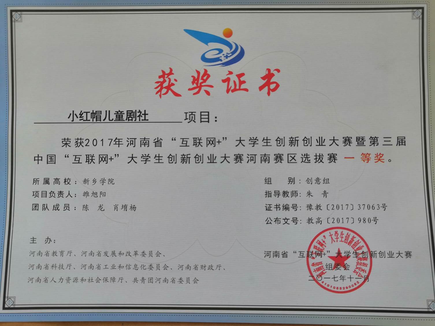雒旭阳同学荣获河南省“互联网+”老员工创新创业大赛一等奖