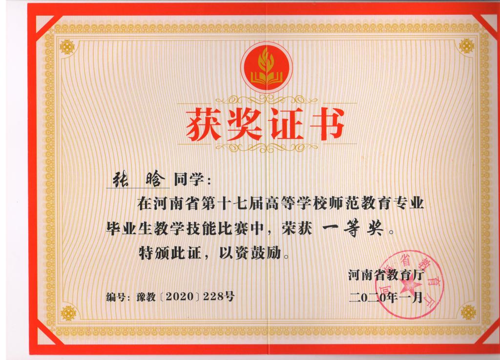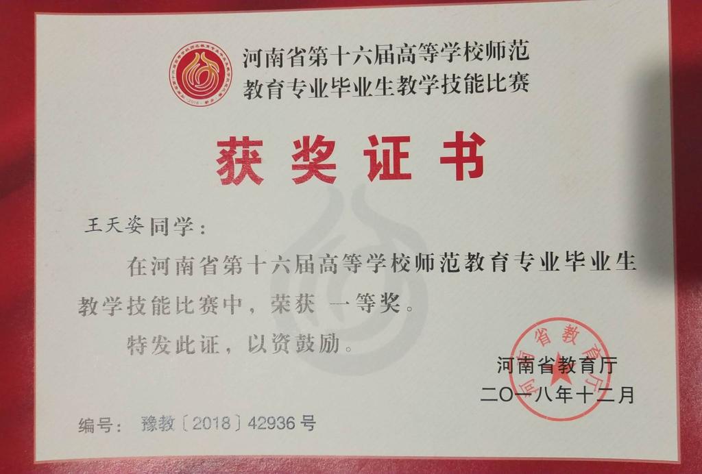 王天姿同学荣获河南省教学技能比赛一等奖