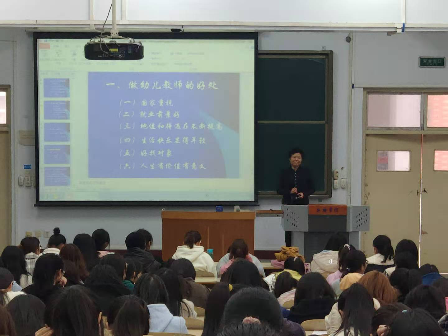 李园长从“做幼儿教师的好处”和“怎样才能成为优秀的幼儿教师”两个方面,为同学们讲述了我国幼儿园的办学现状、相关政策立法,以及成为优秀幼儿教师要具备的知识和技能。在讲到幼儿教师必备知识、技能的时候,李园长引用几则寓言故事和《三字经》、《菜根谭》、《易经》的内容告诉大家做人要礼貌谦让、乐于助人、甘于吃亏、懂得感恩;又援引荀子《劝学》和庄子《逍遥游》告诉大家要有日常积累和文学积淀,才能够写好文章、说好话;此外,学好“幼儿卫生学”、“心理学”、“教育学”等专业理论课程,练好弹琴、唱歌、讲故事、美术、舞蹈、计算机操作等专业技能,了解相关政策文件,都是未来成为一名优秀幼儿教师必备的本领。最后,李园长用“新乡市市直一幼简介” 视频作为讲座内容的结尾,希望同学们珍惜在校学习时间,用努力打造自己的一技之长,用奋斗完成自己的美好人生;并表示欢迎公司优秀员工到园中实习、工作。李园长的讲座生动、精彩,使在座新生对学前教育专业有了更加清晰的认识,为做好学业规划打下基础。