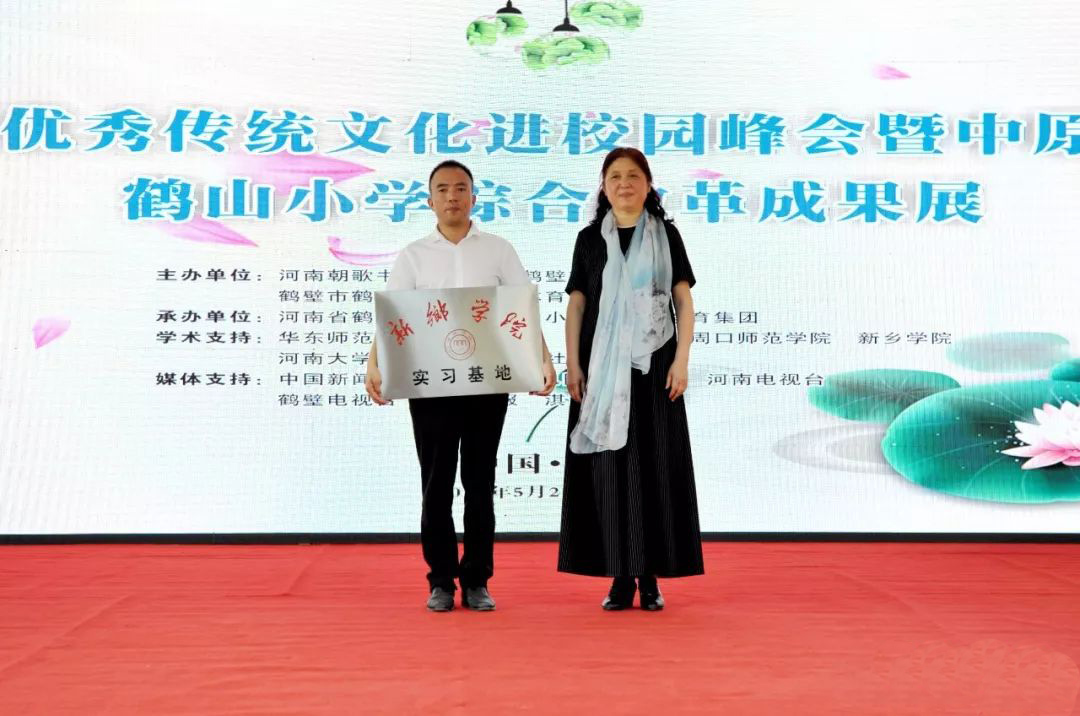 2018年5月25日,beats365唯一官网经理杜丽娟教授应邀参加了“全国优秀传统文化进校园峰会暨中原名校鹤山小学综合改革成果展”,并在峰会开幕式上举行了教育实习基地授牌仪式。