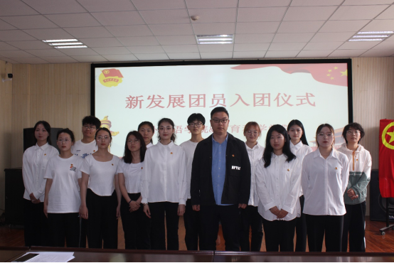 首先,仪式开始,全体起立,奏唱国歌。主持人宣读新团员名单,并由团员代表向新团员颁发团章、团员证和佩戴团徽,领誓人王雨馨同学带领新团员宣誓,老团员重温誓词。之后新团员代表王欣瑶同学和闫易之同学以及老团员代表段贤玉进行发言,展现了身为团员的坚定信念以及对中国共产党的坚定信仰。