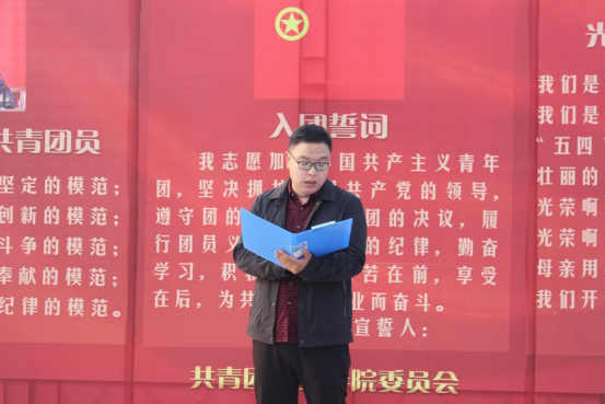 伴随着庄严的国歌,入团仪式缓缓拉开帷幕。首先,主持人宣读了新发展团员入团名单。接着,分团委书记郭正强为新发展团员分发、佩戴团徽。随后,分团委副书记李欣睿带领新团员宣读入团誓词;入团介绍人代表刘子宇同学宣读《团章》中有关团员的义务和权利的条款;新团员代表文梦娇向全体新团员发出倡议,要树立远大理想,始终高举旗帜跟党走;老团员代表军云朵发言,对新团员表示热烈的祝贺与欢迎,也希望团员们能够严格要求自己,以身作则。