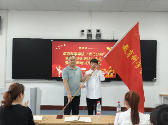 仪式在庄严的国歌声中拉开帷幕。第三期青马班班长张洛仪作结业总结报告,通过“理论学习铸魂”“红色寻根明志”“实践砺能笃行”三个篇章,系统回顾了学员们赴红色基地开展沉浸式教学、组织社区理论宣讲志愿服务、参与乡村振兴社会实践等成长轨迹。第四期学员代表张博文以“让马克思主义信仰照亮青春征程”为题发言,立下了青马学员将以青春之我践行强国有我的誓言。党委书记吕明哲向第四期学员代表授予青马班旗帜,鲜红的班旗承载着青马人的精神传承,象征着马克思主义信仰的薪火相传。