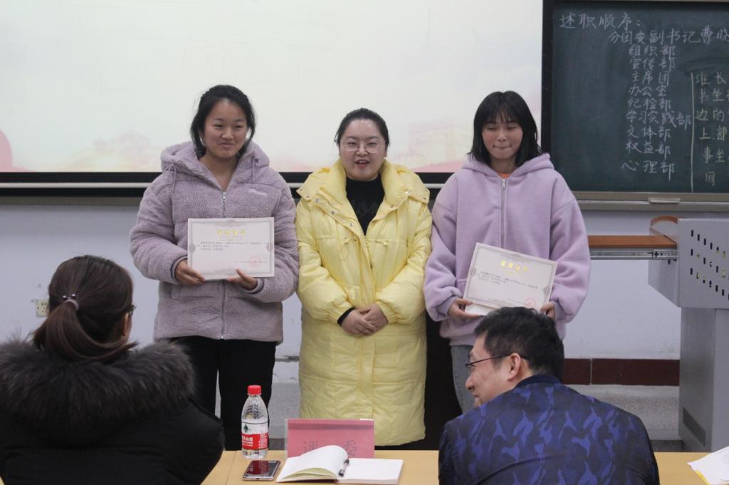 此次报告会上由组织部、宣传部、主席团、办公室、纪检部、学习实践部、文体部、权益部和心理部9个部门的员工干部代表依次进行述职。首先进行述职的是分团委副书记曹晓阳同学,曹晓阳同学主要从三个方面进行工作汇报:工作回顾、工作不足、下一步工作思路和措施,主席团执行主席高俊驰同学在会上代表主席团进行汇报总结,他指出此次述职报告大会不仅是对本学期各项工作的总结与反思,也是对新学年工作的展望与部署。接着由各部门部长发言,各部长以PPT的形式对本部门上半学期的工作情况做出概述,总结了工作上的得失,并结合自身部门特点,向在场成员传授了宝贵的工作经验。各部门述职完毕后,由三位老师为12月份优秀员工干部周楠楠、李思瑶、何佳乐、麦佳茵、王艺龙、王雲龙六人和优秀班干部孙晨曦、廖熙萍两人分别颁发证书和奖品。