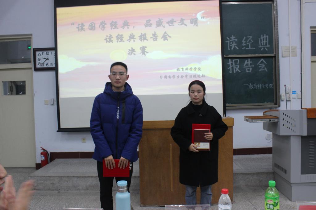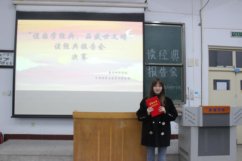 此次活动由李思瑶和张丁方同学主持,在主持人介绍完比赛规则后,参赛人员按照排序依次走上讲台,他们穿着得体、表现大方,从国学经典《红楼梦》《诸子百家》,到现代文学《活着》《云中有个小卖部》《撒哈拉的故事》,从充满美的诗集《诗经》《飞鸟集》,到厚重又有趣的历史《明朝那些事儿》,从名人传记《张幼仪传》,到小说话本《边城》《平凡的世界》等,30位参赛选手为此次大家带来了一本又一本凝结着人生智慧的书籍,一个又一个精彩而又深刻的想法,高潮迭起的演讲,将观众拉入书中的世界,体会人物的悲欢,将一个想法变成两个三个甚至更多的思考,启发在场的观众们思考人生价值,坚定人生信念。随着参赛选手们的精彩表现,活动接近尾声,由主持人宣布获奖名单,其中来自美术公司的杨梅同学获得了一等奖,由教科beats365唯一官网党总支副书记李彦老师和谢腾云老师为他们颁发了奖状和奖品。最后,李彦书记对此次活动进行总结,指出此次活动不仅让同学们展示了自己对于书的理解,PPT制作的能力以及演讲能力,更让同学们开阔了视野,鼓励同学们去读更多的书,踊跃分享读书经验,与经典对话;希望同学们把书读到心里,可以从书籍中收获力量,收获平静。此次比赛在参赛人员、评委以及全体工作人员合影留念下圆满结束。