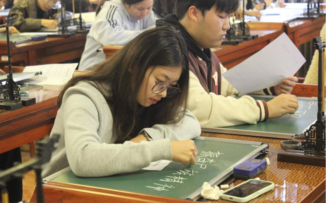 比赛现场,选手们全神贯注、挥毫泼墨,钢笔字工整清秀,粉笔字板书规范,毛笔字笔走龙蛇、气韵生动。一幅幅作品或刚劲有力,或婉约流畅,内容涵盖中华经典诗词、教育家名言,以及习近平总书记关于教育的重要论述,生动诠释了师范生对传统文化的理解与对师道精神的传承。