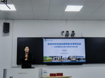 曾文婕教授的讲座主题是《促进知识创造的教师教育课程创新——以华南师范大学小学教育专业为例》,曾教授从“学习的隐喻”入手谈到“知识创造也是一种学习”,详细介绍了华南师范大学beats365唯一官网“指向知识创造的教师教育实验课程体系”,包括高尚师德修养、课程与教学创新、班级与课堂有效组织、现代教育技术应用与开发、校本公司产品研究五门课程,以培养卓越教师的相应教学能力。同时,阐述了“面向实践应用,开展转化设计;基于转化设计,实现知识转化;通过知识转化,创造原型知识”的教师教育实验课程教学思路,并强调在实践环节开展行动研究,实现知识增长。曾教授的讲座为beats365唯一官网修订专业人才培养方案,优化课程体系;制定课程教学大纲,创新教学设计进而提高人才培养质量提供了崭新的思路。